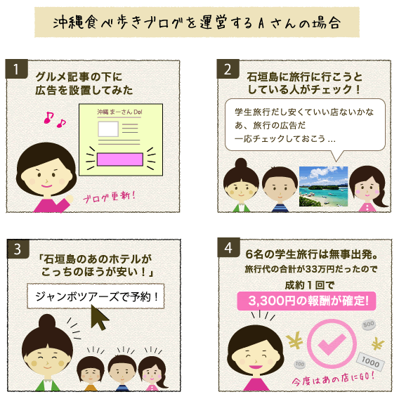 アフィリエイトプログラムから予約する旅行商品と通常の旅行商品はまったく同じ商品です。アフィリエイトから予約をしてもお客様が余分にお金を払ったりすることはありません。