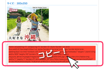 あなたのサイトにあった大きさやデザインで使うバナーを決めます。(画像なしのテキストタイプの広告あります)。それぞれのバナーの下にあるソースコードを選択、コピーします。