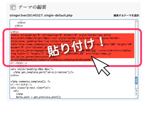 バナーを掲載したい箇所にコピーしたソースタグを貼り付けます。一般的なブログであれば、テンプレートやテーマの編集画面で行います。