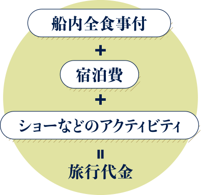 宿泊費とメインレストラン、ビュッフェレストランのお食事、オリジナルドリンクパッケージが含まれます。また、フィットネスセンター、アート&クラフト、スクウォック・クラブ(子供向けの託児・アクティビティ施設)、生演奏、エンターテイメントショーなどの料金も含まれます。※追加料金が適用されるのは、船内チップ、Wi-Fiおよびモバイル接続料、寄港地ツアー、ビデオゲーム、ワンダーアクティビティ、スパ、特別施設のご利用などです。