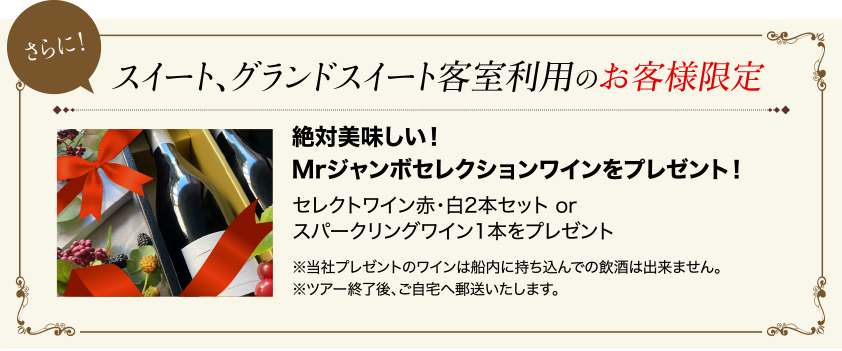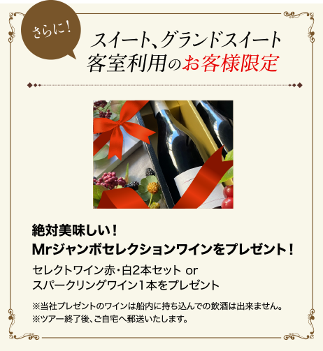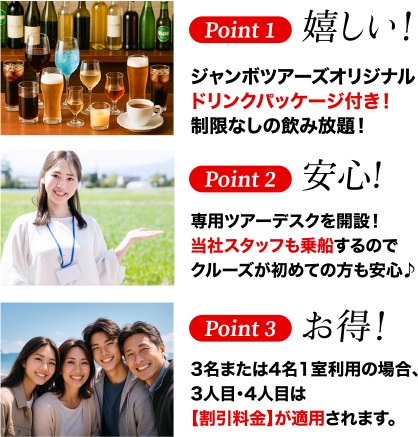 4日間のクルーズ中、“ジャンボツアーズオリジナルドリンクパッケージ”が込みとなっております。