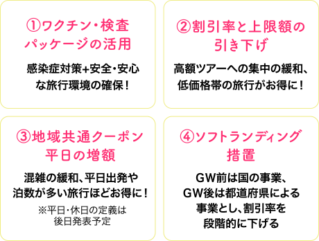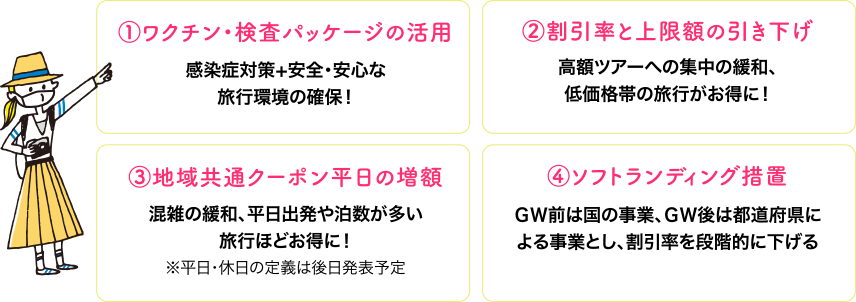 今回は、給付の上限額や割引率を引き下げ、平日の地域共通クーポンの増額、GW等の繁忙期を除外する事によりピーク期の集中を避け低価格帯のツアーやより多くの観光事業者への支援、また、ワクチン検査パッケージを活用し安全・安心な旅行環境を確保するのが、大きな改定内容になります。