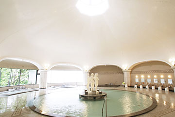 高い天井から燦燦と降り注ぐ陽光。昭和13年創業当時のモダンスタイルを今に引き継ぐドーム型大浴場。