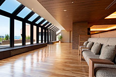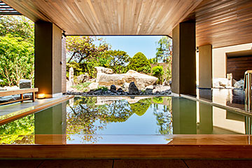 洞爺湖が目線に広がるインフィニティ露天風呂と太陽光で表情を変える絶景を楽しめる大浴場。