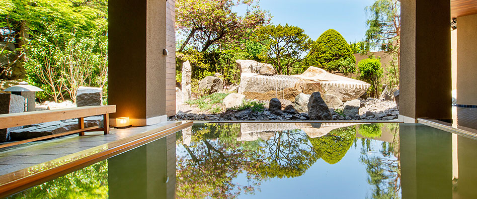 春は桜、夏は青葉、秋は紅葉、冬は淡雪。移り変わる景色を望む大浴場です。