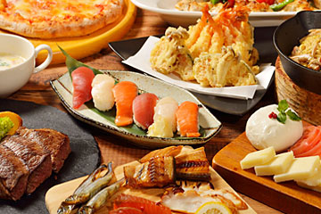 ライブキッチンで作られる料理は和洋中約90品。チーズ工房と燻製室を併設したビュッフェです。