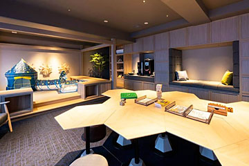 キッズコーナーはボールプールや積み木、大人向けにはボードゲーム、ブックコーナーを設置。