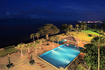開放感溢れる広々としたウッドデッキでゆっくりと寛げます。夜間は水中照明でライトアップ。