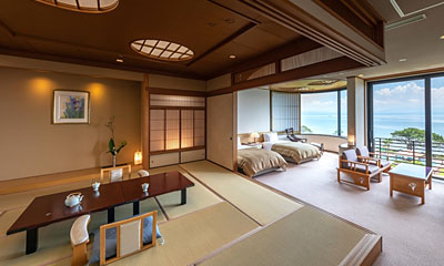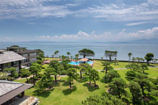 全室禁煙。松の庭園そして錦江湾、対岸の大隅連山を望む絶景をお楽しみいただけます。