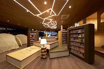 1万冊のマンガ本や書籍が並び、本をかたどったソファや個室キャビンがあります。