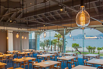 広い窓から伊王島港を一望。季節の食材を和洋中で楽しめるバイキングレストラン。