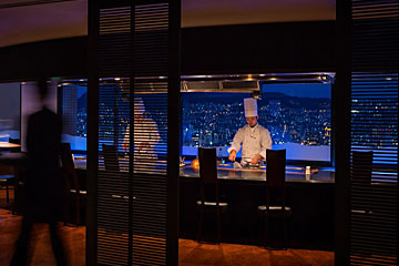 夜景を一望する鉄板焼きレストラン。海の幸山の幸を目の前でシェフが調理します。