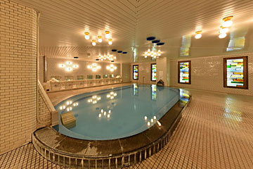 南館2階の大浴場。浴槽に沈められた鉱火石は、水に触れると体に良い遠赤外線を放出します。