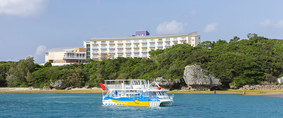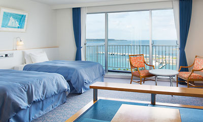 お部屋はすべてバルコニーが海に面したオーシャンビュー。窓の外からは、エメラルドグリーンの海と美しい青空が一望できる、開放的なお部屋をご用意しております。また「もとぶ元気村」では、イルカ・マリン体験など様々なプログラムを年間通してお楽しみいただけます。