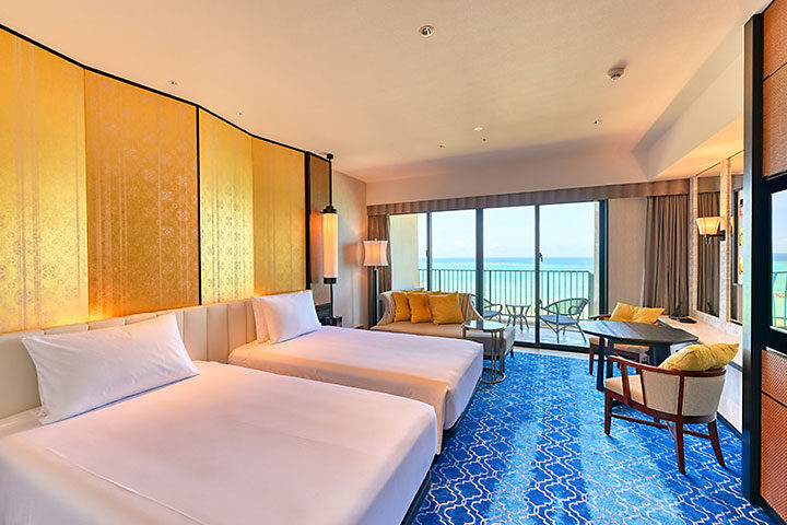 オーキッドプールや青く輝く美ら海を望むビーチフロントウイングに位置し優美な南国の光に祝福される50平米のゲストルームです。