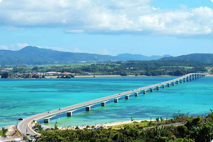 今帰仁村の古宇利島と名護市の屋我地島を結ぶ全長1,960mの橋「古宇利大橋」は、橋の両側にエメラルドグリーンの海が広がり、沖縄を代表する人気のドライブコース。古宇利島は別名「恋島」と呼ばれ、島の北側ティーヌ浜にはハート型の岩「ハートロック」があり人気のスポットです。
