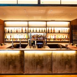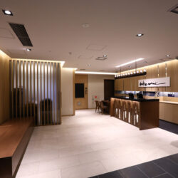 かつて宿場町として栄えた新宿を回想させる、江戸の伝統的な和の要素を取り入れた内装.