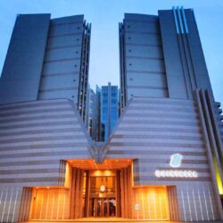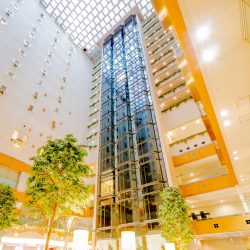 円筒形の高層建築が印象的な高級ホテル。高い天井の上が吹き抜けの露天風呂もお楽しみいただけます。