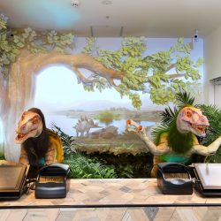 フロントには2体の恐竜ロボットとロボホンコンシェルジュ3体がお出迎え!