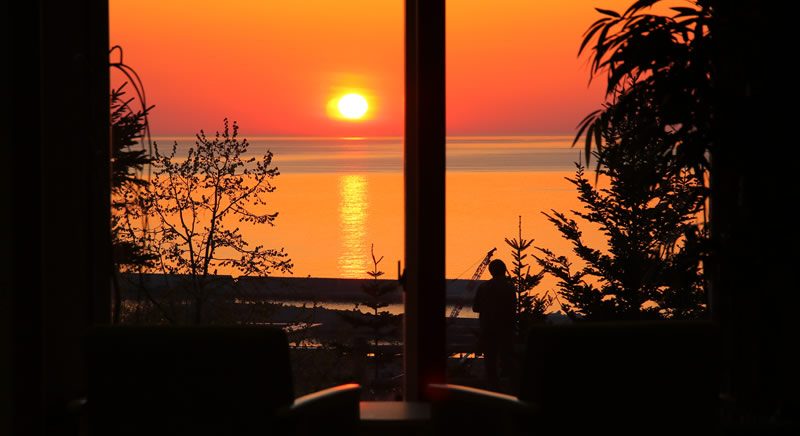 5月~9月は当館「ラウンジ茜」からオホーツク海に沈む夕日をご覧いただくことができるラウンジです。