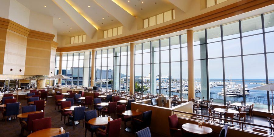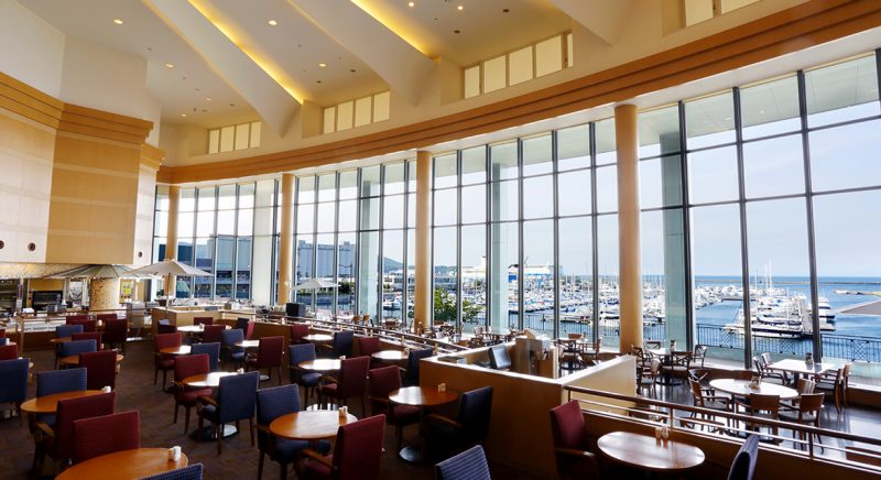 どの席からも窓の外が見えるように設置されたテーブル席にゆったりと腰掛け、石狩湾と小樽港マリーナの美しい眺めをお楽しみください。