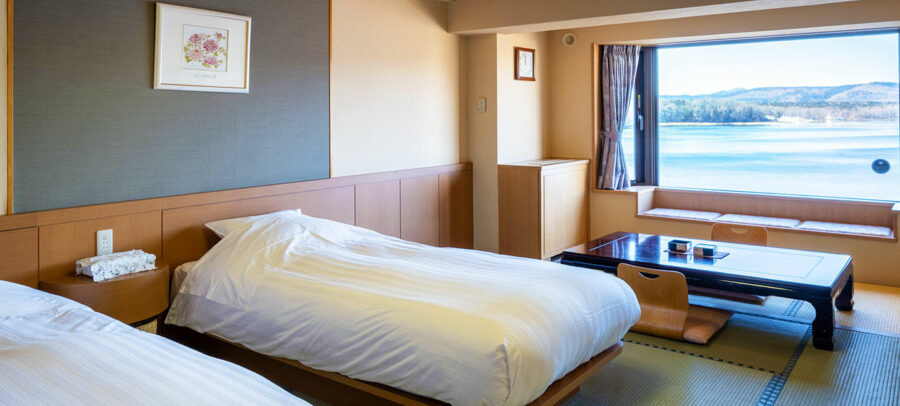 和室にベッドを設置した、湖側のお部屋です。窓の外に広がる阿寒湖を眺めながら、心やすらぐひとときをお過ごしください。