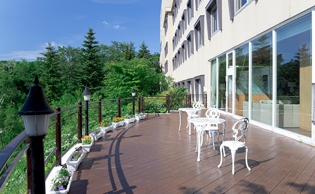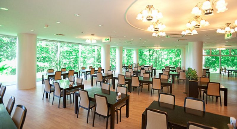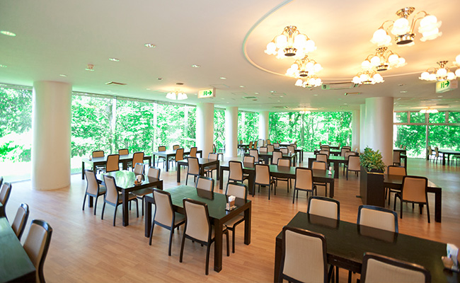 ゆったりとした空間でお食事をお楽しみください。開放的なレストラン フォーレの窓際に、エゾリスが遊びに来ることがあるのも当館ならではです。