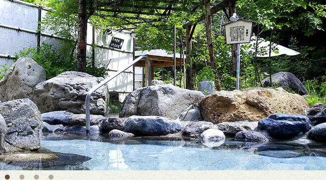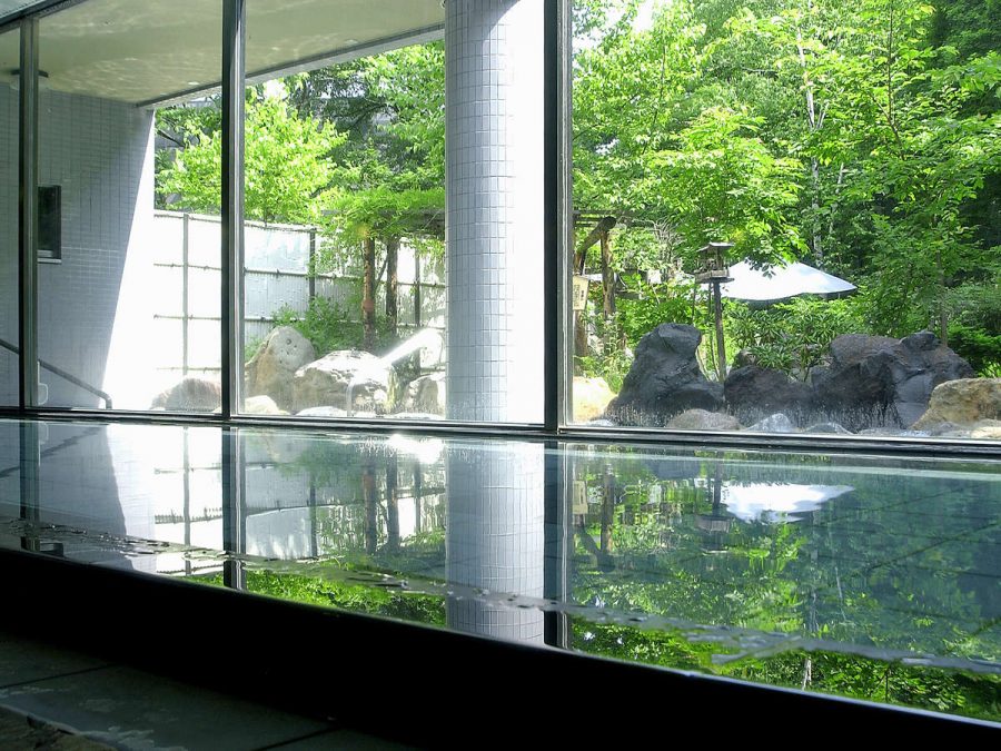 大きな窓のある大浴場にはサウナも完備され、岩造り露天風呂がございます。日暮れとともに螢をイメージした幻想的なイルミネーションが瞬き、森林浴気分を味わえる開放的な露天風呂です。