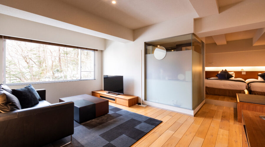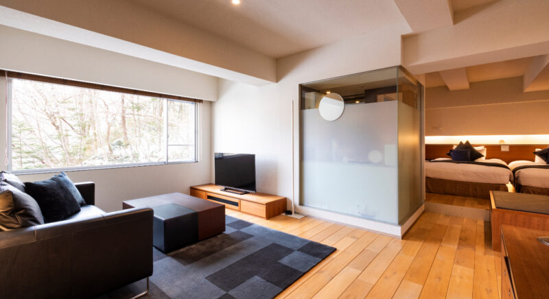 コンパクトながらくつろぎの空間が広がる50m²のジュニアタイプ。お手軽にスイートの旅をお楽しみいただけます。お部屋で快適におくつろぎいただけますようパジャマ、バスローブ、浴衣、作務衣をご用意。また、世界的に認められるコスメティックブランド「THANN」のヘアケア&スキンケア用品をはじめ、良質のアメニティを幅広く取り揃えております。