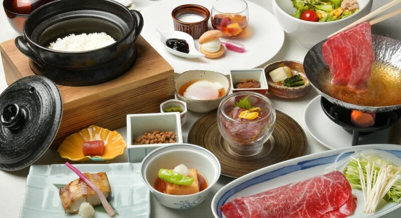 お目覚めのドリンクは5種類の中からご選択いただき、釜炊きごはんとごはんに合うおかずが並ぶ和食か、焼き立てパンと道産ブランド肉の肉料理を愉しむ洋食を、お好みでお選びください。 -