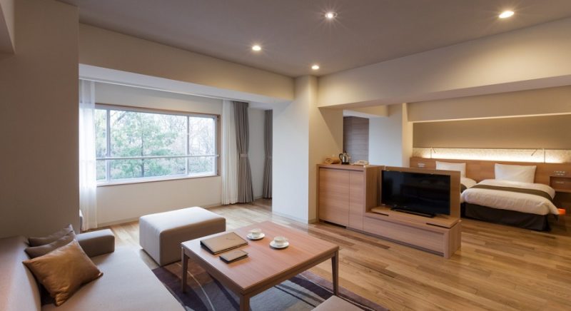 柔らかな木の温もりに包まれる贅沢な広さの空間に、モノトーンカラーの家具を設えたシックな客室フロア。