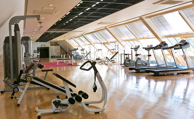 230㎡の広さと充実のトレーニング機器を備えた トレーニングルーム。眺望も抜群で、軽めのエクササイズからアスリート向け本格的トレーニングに対応できるマシンが そろっています。(有料)