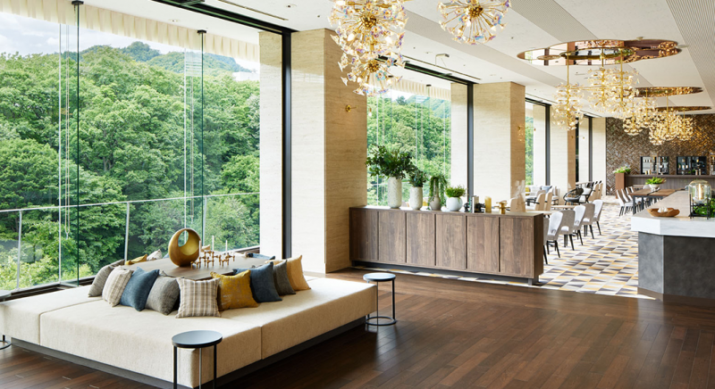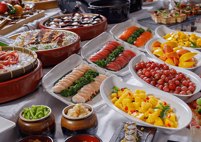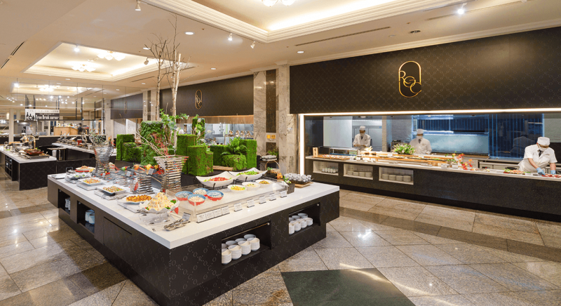 ブラックとゴールドを基調とした高級感溢れる空間デザイン。唯一無二の安全・安心な新ビュッフェスタイルで、旬な食材で作られる多彩な料理をお楽しみください。