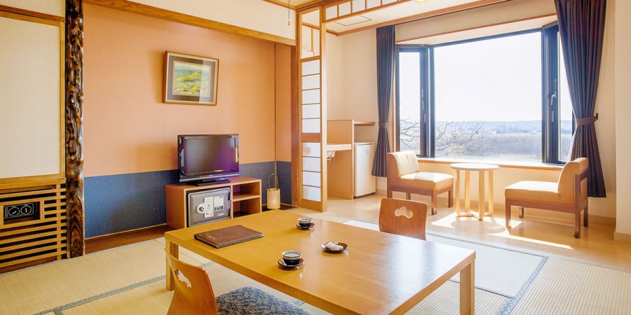 出窓のある広縁から明るい日差しが広がる落ち着いた和室です。眺望は、十勝川を望むお部屋と田園風景を望むお部屋の2タイプございます。