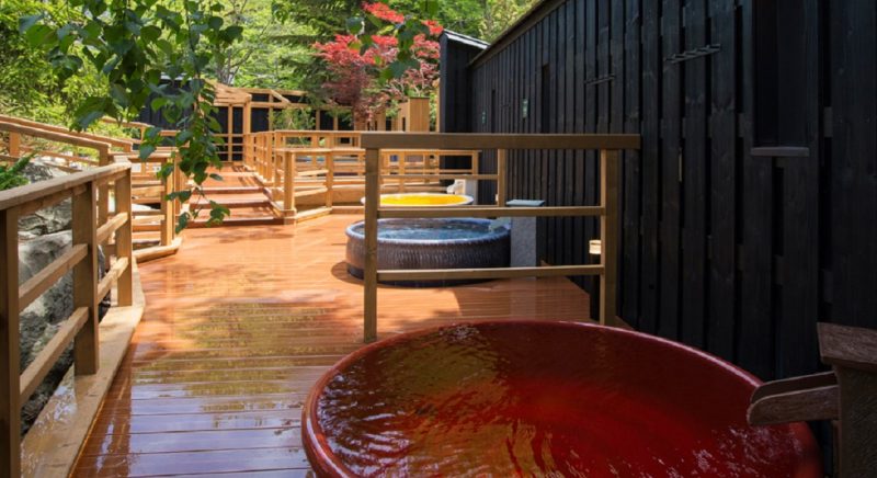 森の中を散歩するように回廊を渡ると、柚子、りんご、ヒアルロン酸などバラエティ豊かな20の香り湯が出現。
