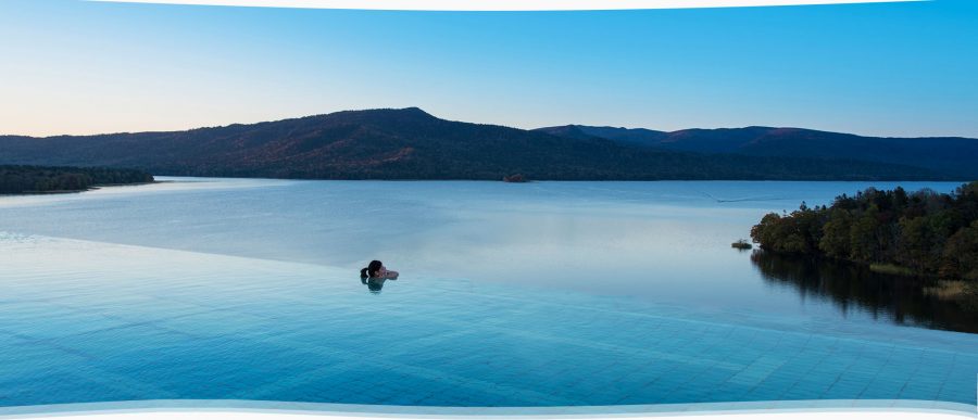 スパと阿寒湖が一体になったかのように見えるインフィニティ・エッジ・スパ。