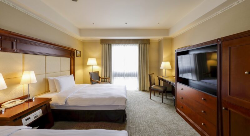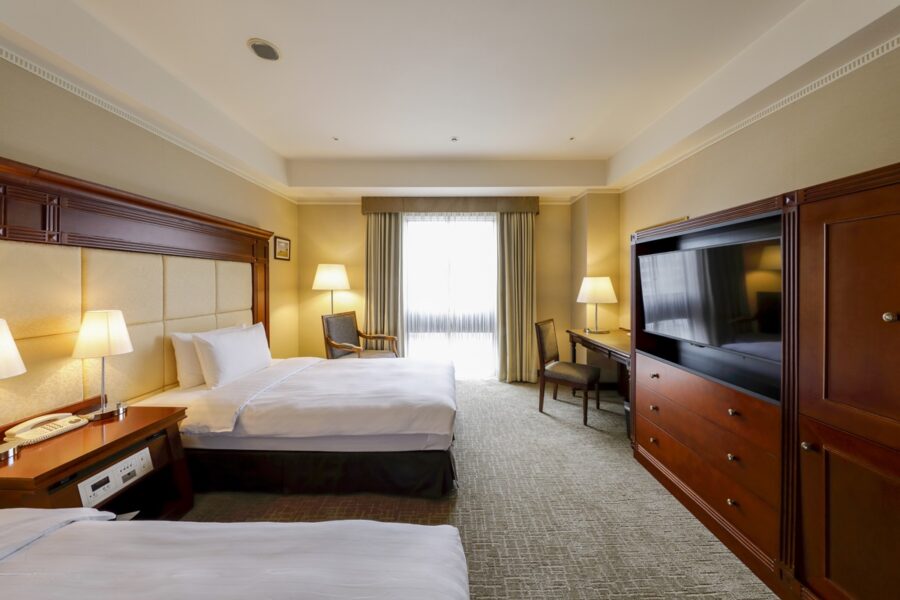 36㎡と広めの空間が特長のツインルーム。重厚感のあるバスルームにはセパレートタイプのシャワールームを標準完備しており、プレミアホテル-TSUBAKI-札幌の居心地のよさを感じていただける客室です。