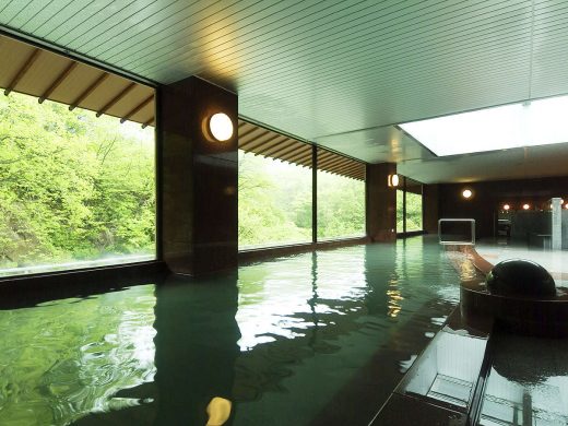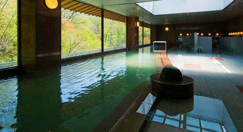 明るい陽射を受けながら、四季折々の自然のパノラマを満喫できる辛夷館8階空中大浴場。登別の景色を眺めながら心和む湯浴みをお楽しみいただけます。