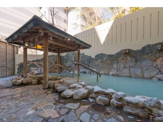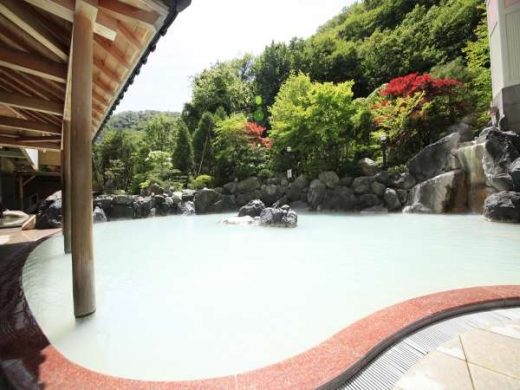 最上階の窓越しから山々の風景が眺められる開放感満点の銀杏館7階空中露天風呂。檜造りと信楽焼きの2種類の浴槽で、趣の異なる湯浴みが楽しめます。