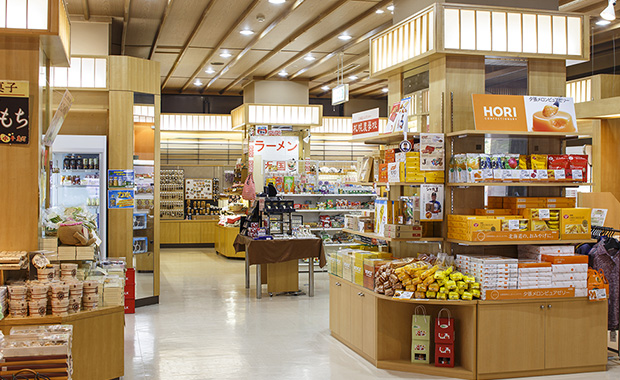 北海道ならではの蟹や鮭、登別限定のお菓子・鬼グッズなど多数取り揃えております。 また、コンビニコーナーを設け、ジュース、菓子スナック類、日用雑貨もご用意しております。