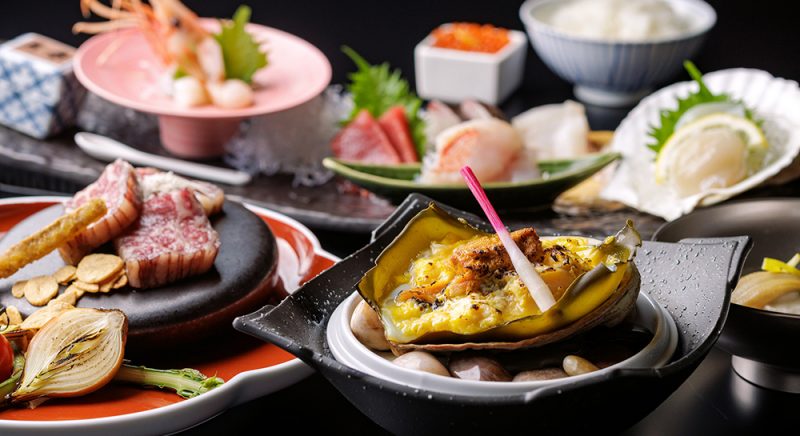 ご夕食は食事処にて和食会席をご用意。素材の旨味を最大限引き出した章月グランドホテルこだわりのお食事をお楽しみください♪