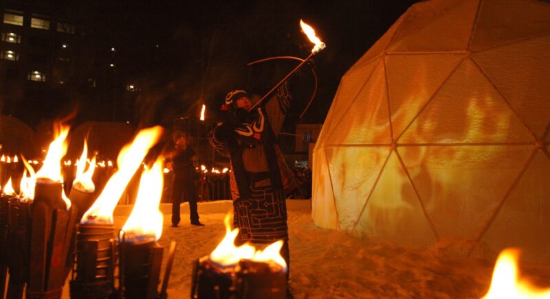 約10,000平方メートルもの広さを誇る石狩川の河川敷の会場に、極寒の自然を生かして作られた多彩な氷像が並びます。氷の展望台や氷柱、氷のトンネル、アイスドームなど迫力満点なスケールに感嘆!夜には七色のライトアップによって幻想的な光景が作り出され、日中とはまた違った雰囲気を楽しむことができます。