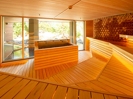フィンランド製のサウナストーブと国産檜で作られた空間は、水蒸気(ロウリュ)でからだをじっくりとあたためる「我慢しないサウナ」。
