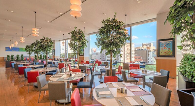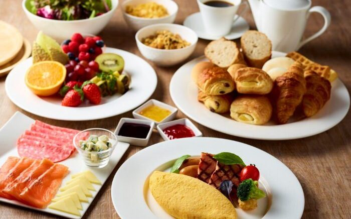 天井が高く太陽の光が差し込む開放的なレストランで種類豊富な朝食ブッフェをお楽しみください。