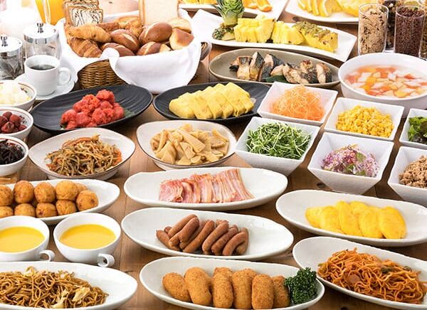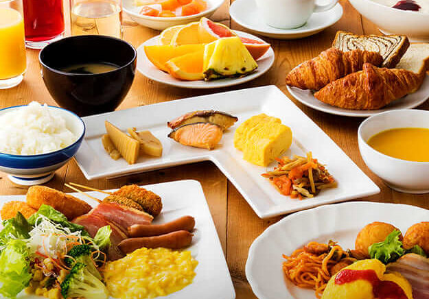 ご飯は兵庫県産の米を使用。他に十六穀米、おかゆもご用意しております。焼きたてのクロワッサンや豊富な種類のドリンク、サラダなどとともに「たこ焼きバー」大阪ならではの名物もお楽しみください。