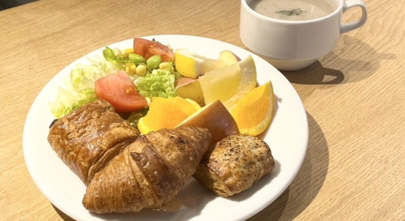 焼き立てパン3種類、日替わりスープ、サラダ、フルーツ、ドリンクを合わせた軽朝食をご用意しています。