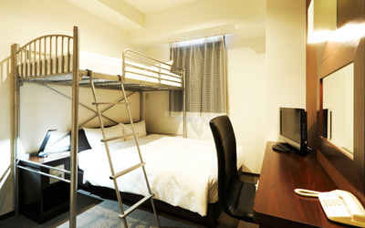 セミダブルベッド1台に、ロフト式ベッド1台を設置したお部屋です。