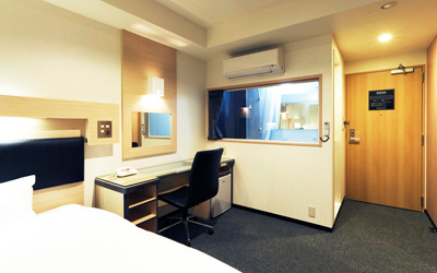 セミダブルベッド1台のスタンダードなお部屋。開口サッシ窓付のユニットバスとなります。