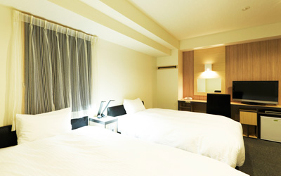 セミダブルベッド2台のお部屋です。3名・4名利用の場会はベッド1台をダブルとしてお使いいただきます。※エキストラベッドはございません。