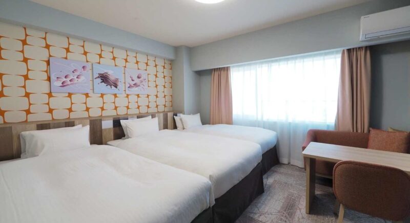 25㎡のお部屋に110cm幅のベッド2台、スタッキングベッド1台設置で合計3名様までご宿泊いただけます。